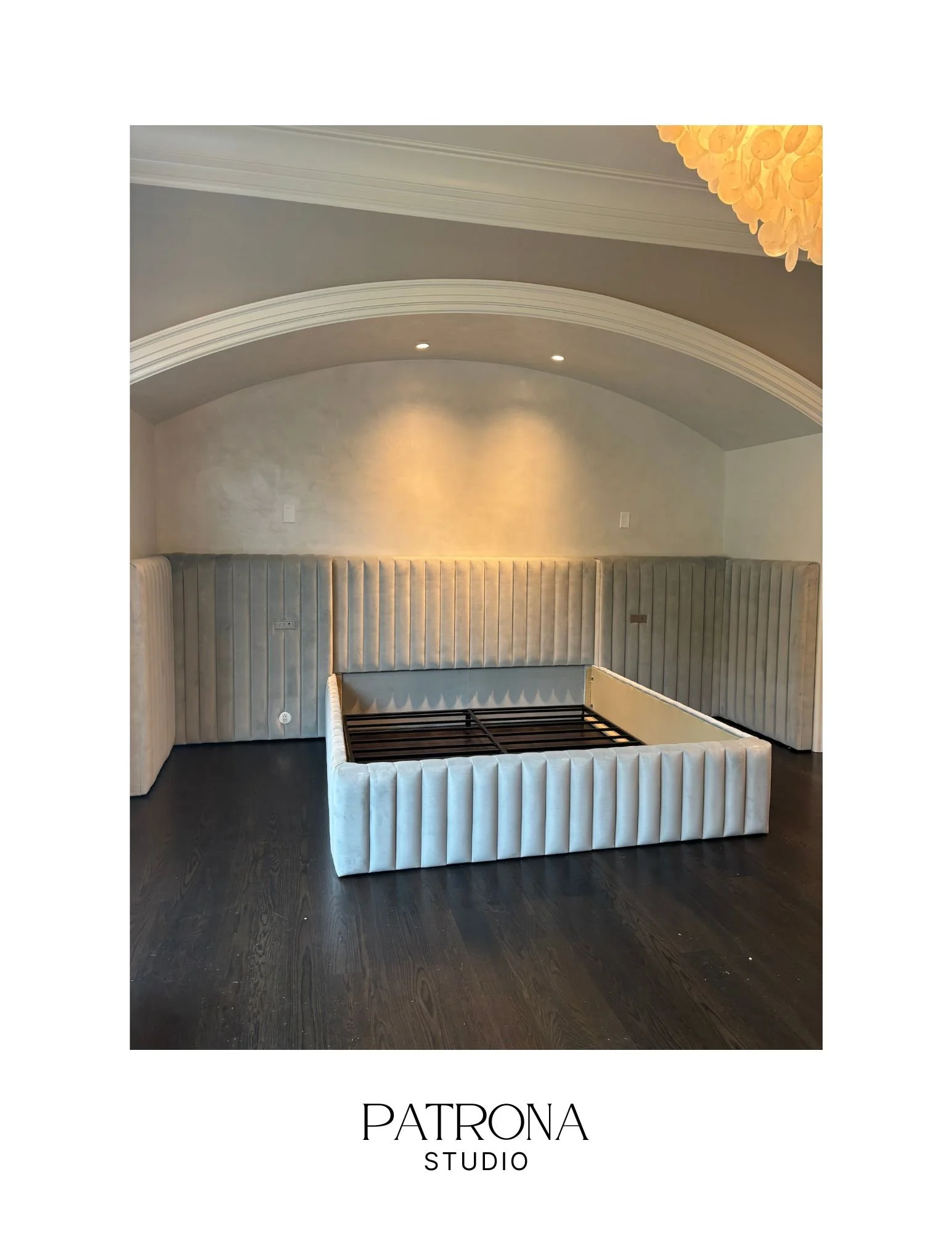 Patrona Studio collaborated with nationally recognized designer Heather Garrett Designs to fabricate a suite of custom upholstered pieces for a large-scale luxury residential project. The scope included a fully integrated custom upholstered bed and upholstered wall panels for the primary bedroom, as well as a bespoke curved settee designed specifically for the home’s foyer.